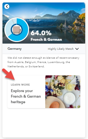 Under the Ancestry tab, select Ancestry Overview, then click the button “View Your Ancestry Composition.” Select an ethnicity and then “Learn More,” as shown here. When the new screen comes up, scroll down to the bottom of the page. Then you’ll see a few DNA matches who share this ethnicity: