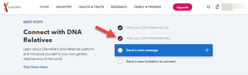 When you log in at 23andMe, an option to see your DNA match locations appears at the top of the page: