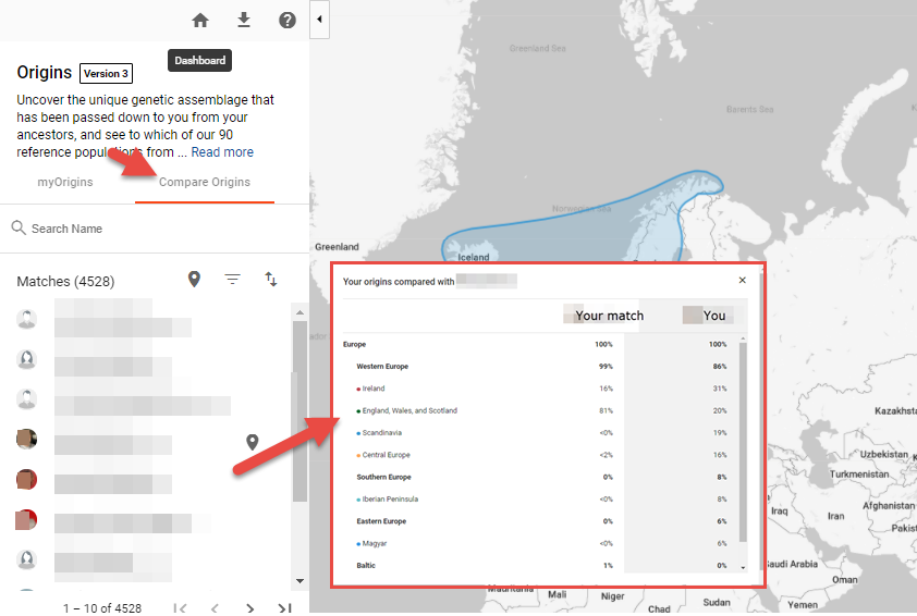 You can also click the Origins tab near the top of a match’s profile to compare your ancestral regions to theirs.