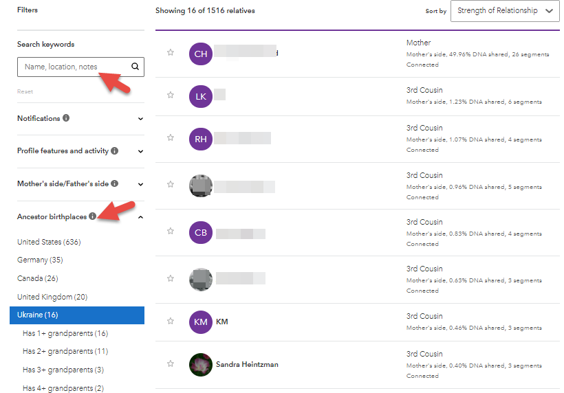 You can also search your entire DNA match list for ancestral locations associated with your DNA matches. Either run a keyword search for a location or scroll down and open the Ancestral Birthplaces options. Click on a country to filter your matches to people who have at least one grandparent from that country. (You can also refine your search here to matches who have multiple grandparents from that country.) Keep in mind though, that most people at 23andMe have not entered any location information. So you could have matches from your desired location, but they won’t show up in your search.