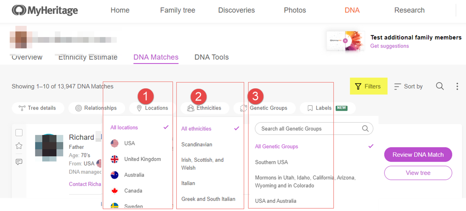 When you go to your MyHeritage DNA match list, turn on the filters. You can sort by your match’s location here, too, as shown (#1). You can sort by shared ethnicity (#2) (Note: as of October 2023, this feature has been disabled until further notice). But the most illuminating place sort is by Genetic Group, most of which are affiliated with at least one place. Genetic Groups identify clusters of testers who all share genetic ties with small, specific places or migratory groups.